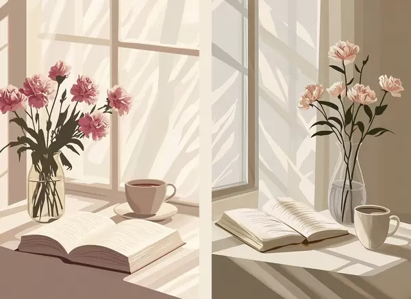 Plakat Abstrakcja, poranna estetyka, filiżanka kawy, książka, kwiaty d00448