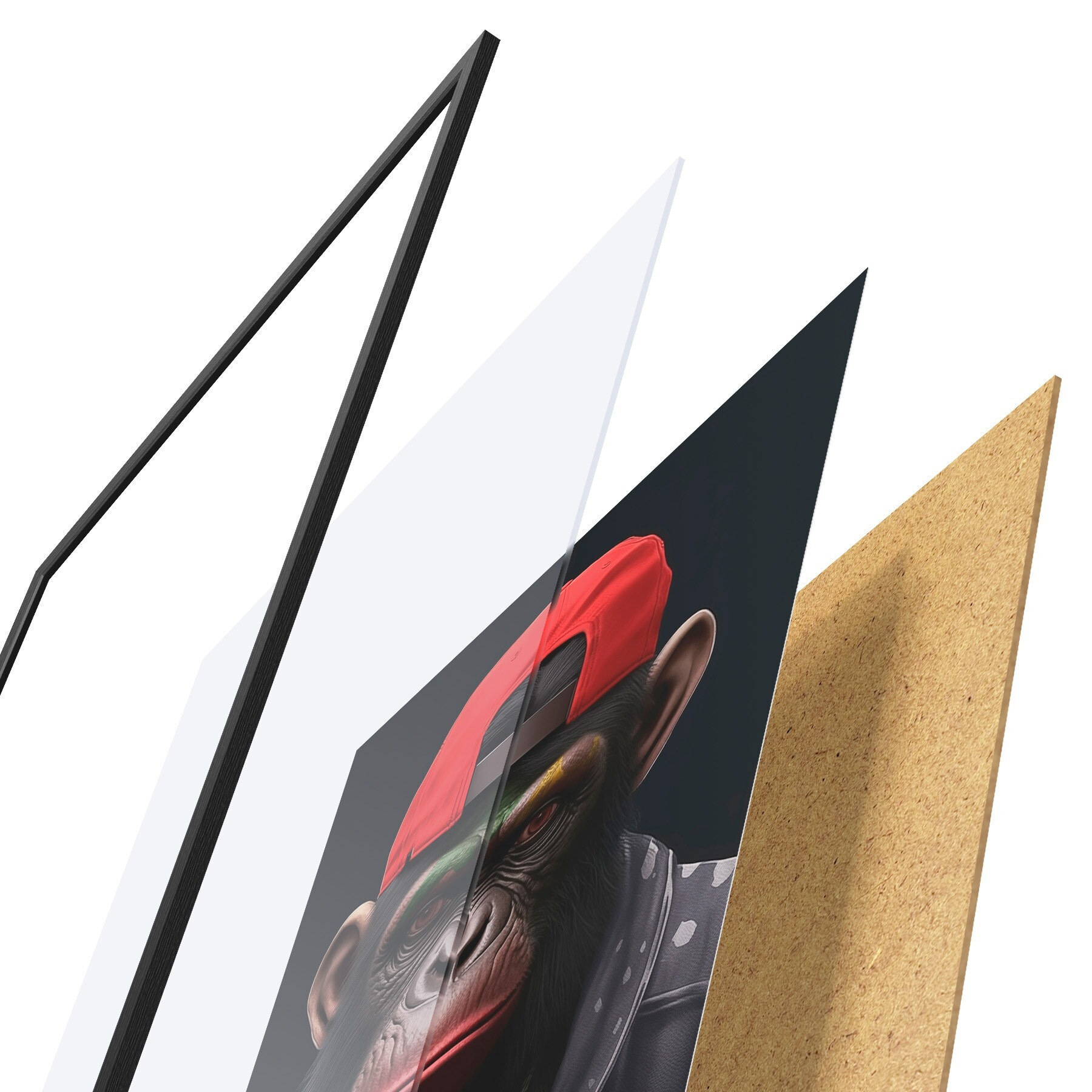 Plakat składa się z ramy, pleksi, wydrukowanego obrazu i podkładu z płyty wiórowej. Plakat można natychmiast zawiesić na ścianie dzięki uchwytom z tyłu.
