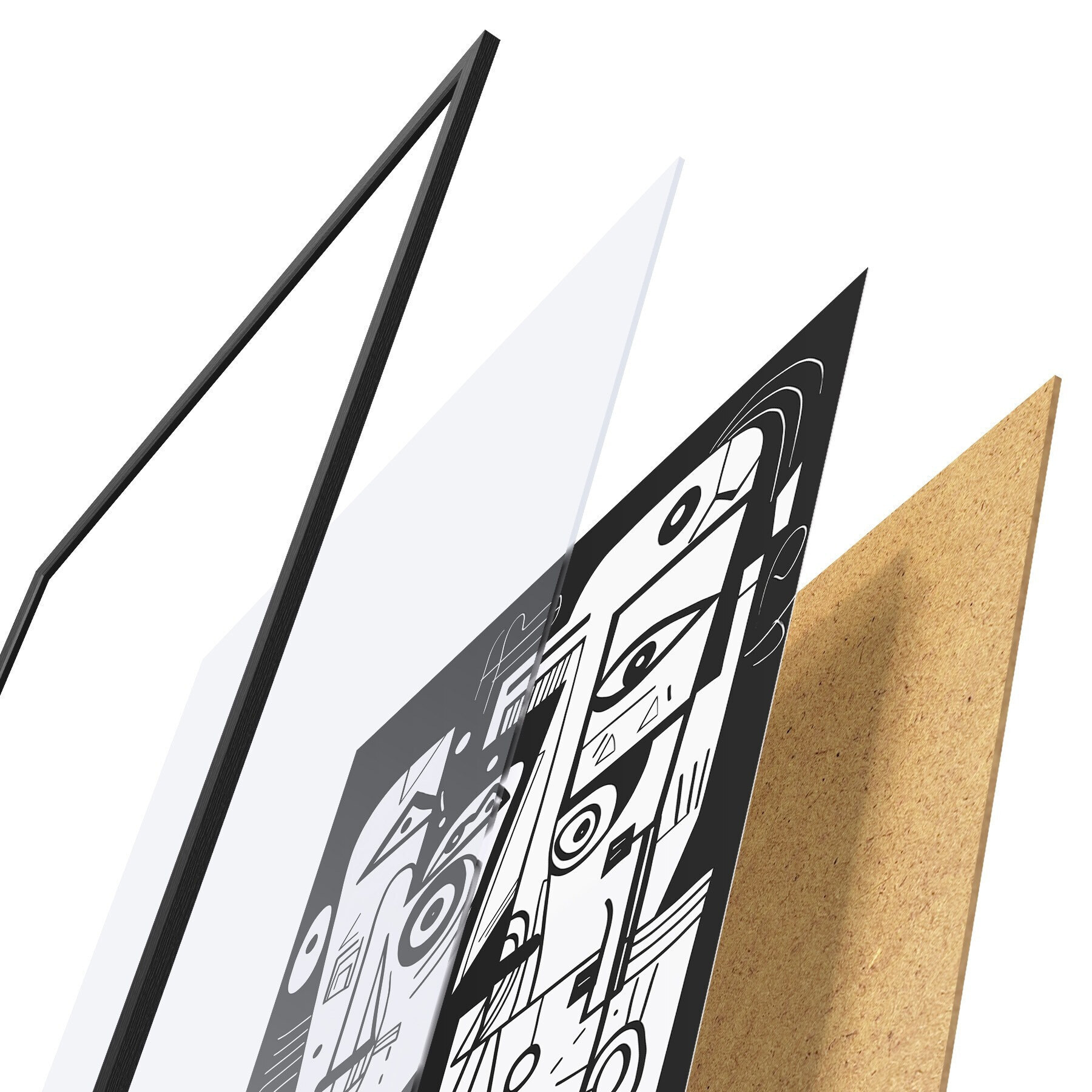 Plakat składa się z ramy, pleksi, wydrukowanego obrazu i podkładu z płyty wiórowej. Plakat można natychmiast zawiesić na ścianie dzięki uchwytom z tyłu.