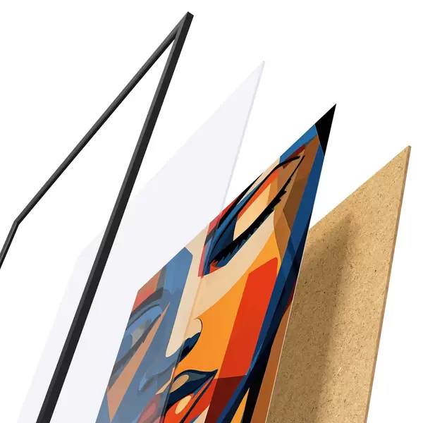 Plakat składa się z ramy, pleksi, wydrukowanego obrazu i podkładu z płyty wiórowej. Plakat można natychmiast zawiesić na ścianie dzięki uchwytom z tyłu.