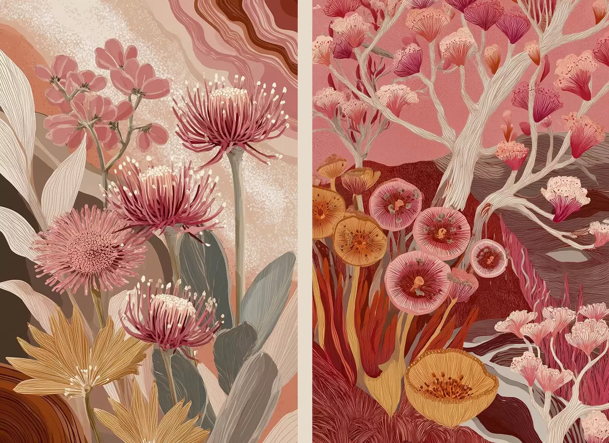 Poster Kwiaty w stylu boho, szczegółowy rysunek, bordowe kolory Nr d00476