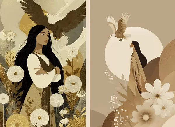 Poster Kobiety z latającymi orłami, styl plemienny, beżowe kolory Nr d00477