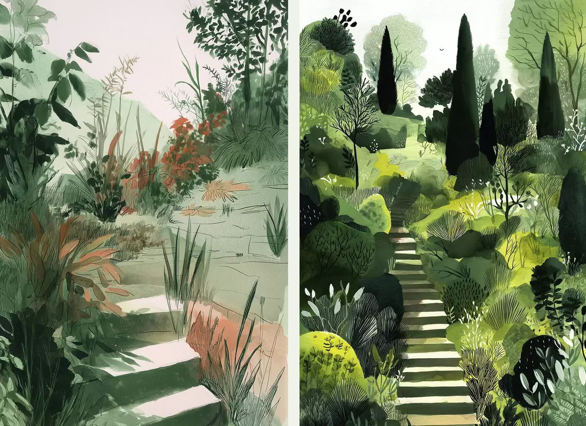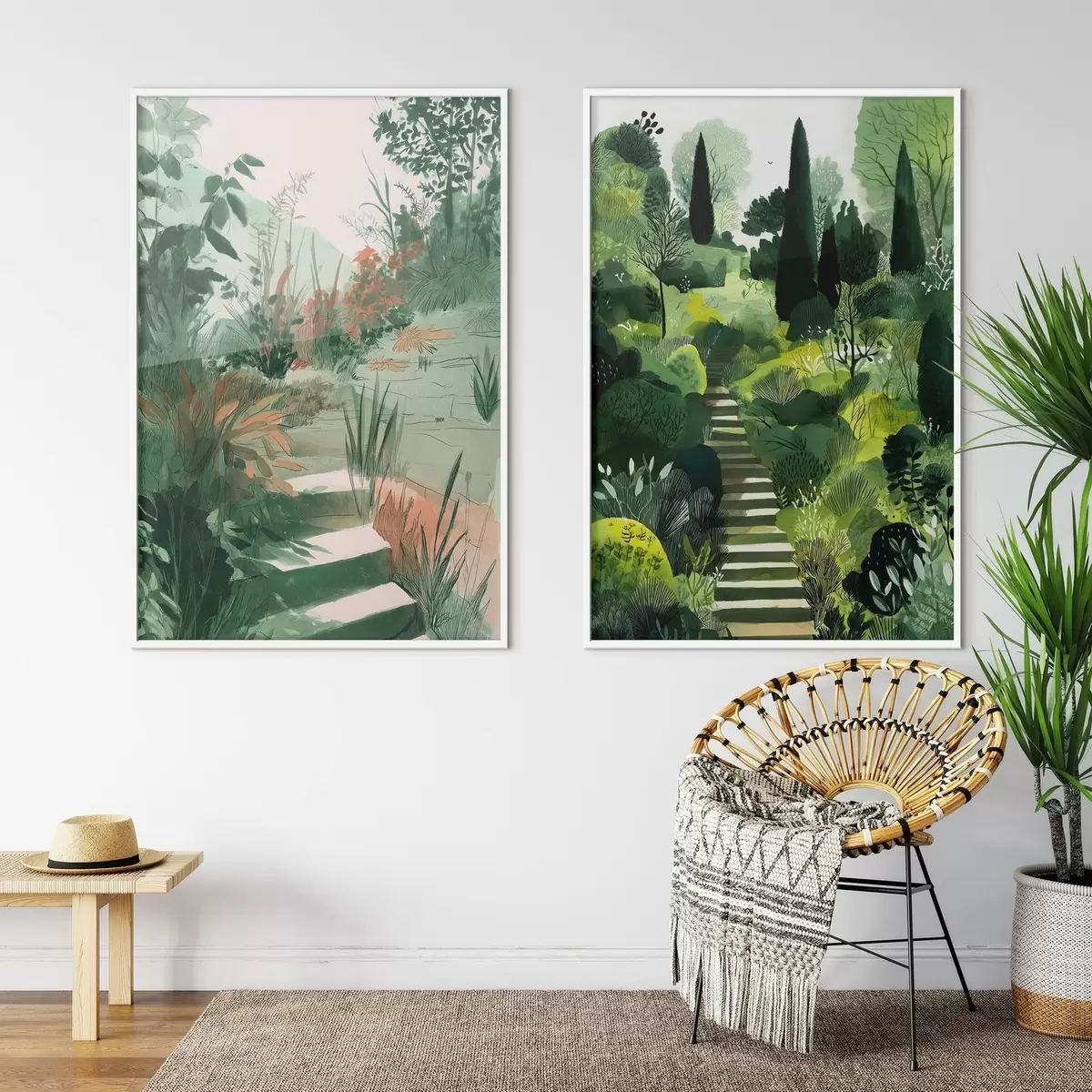 Plakat Zielony orientalny ogród z krzewami i drzewami d00478