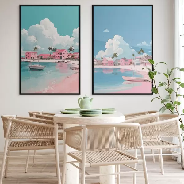 Plakat Różowa letnia plaża ze słońcem, żaglówką i domami d00479