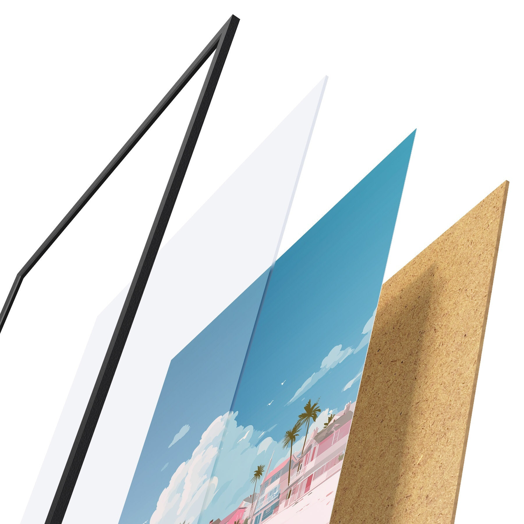 Plakat składa się z ramy, pleksi, wydrukowanego obrazu i podkładu z płyty wiórowej. Plakat można natychmiast zawiesić na ścianie dzięki uchwytom z tyłu.