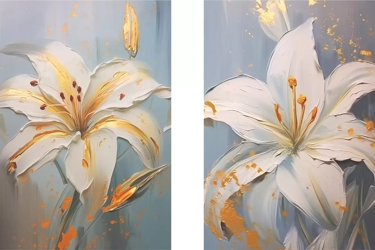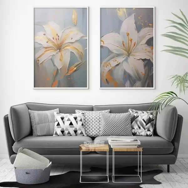 Poster Białe lilie z żółtymi kreskami na niebieskim tle Nr d00497