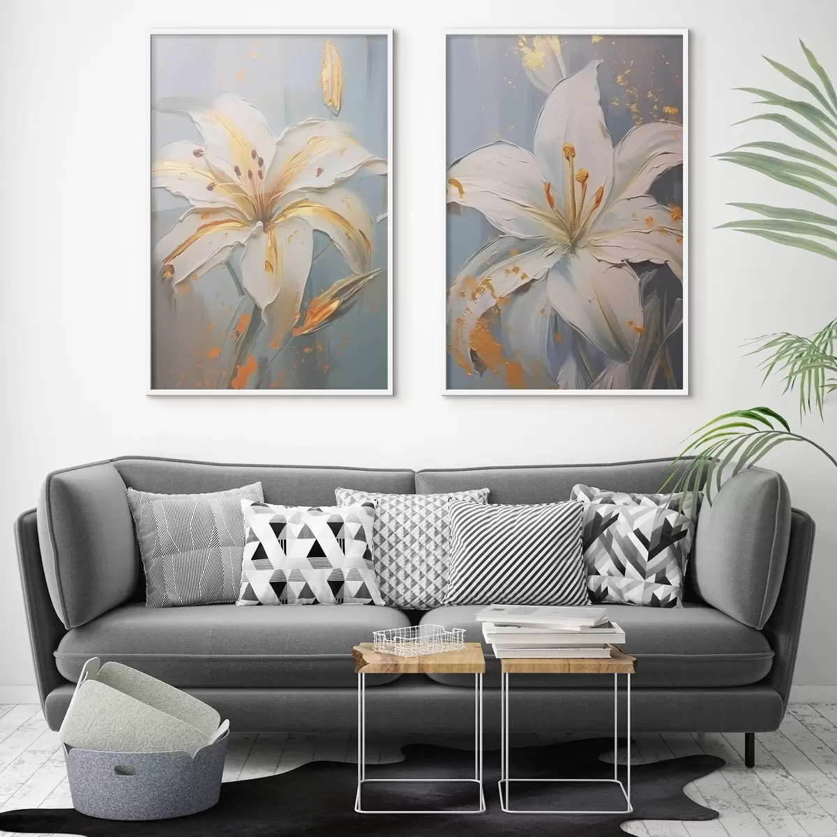 Plakat Białe lilie z żółtymi kreskami na niebieskim tle d00497