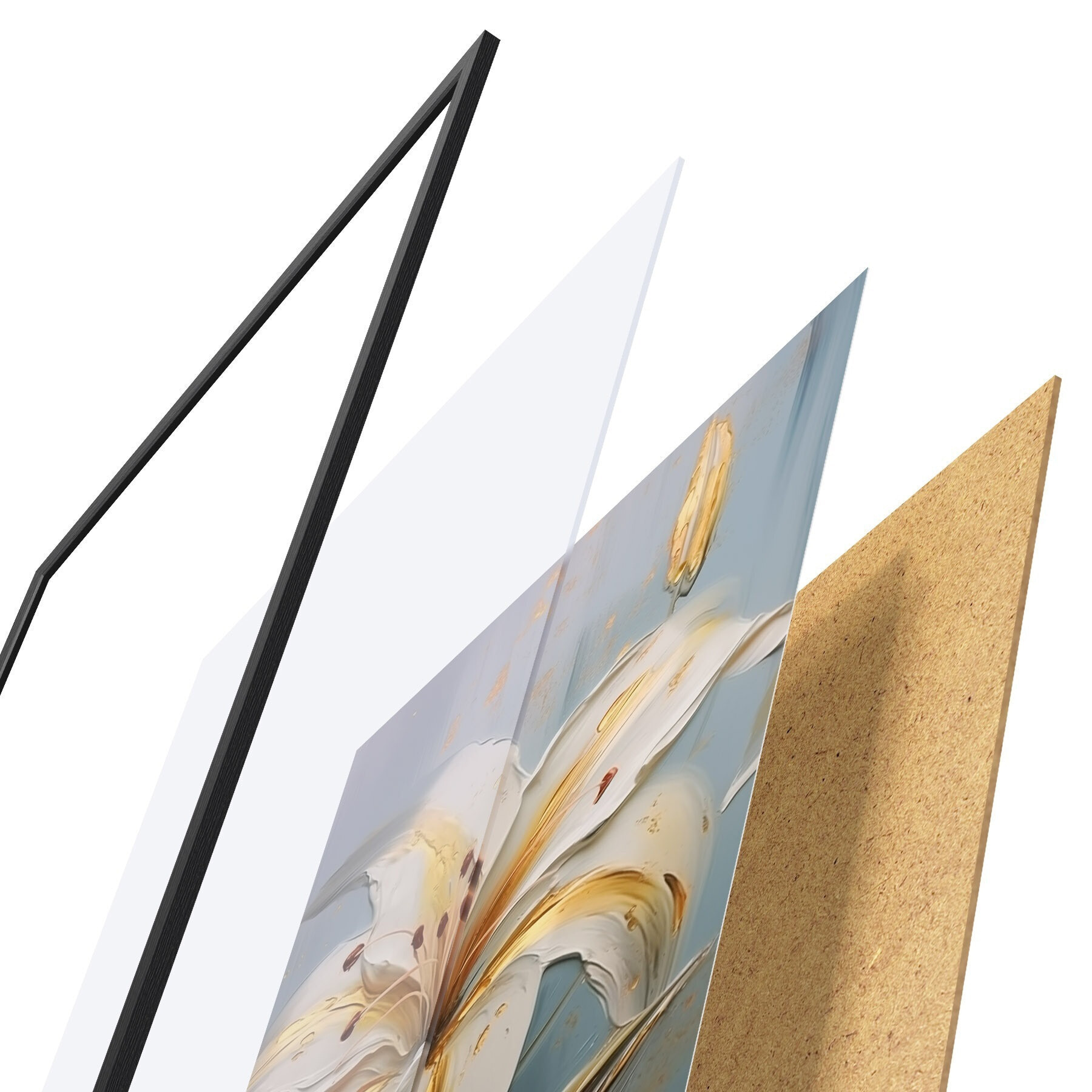 Plakat składa się z ramy, pleksi, wydrukowanego obrazu i podkładu z płyty wiórowej. Plakat można natychmiast zawiesić na ścianie dzięki uchwytom z tyłu.
