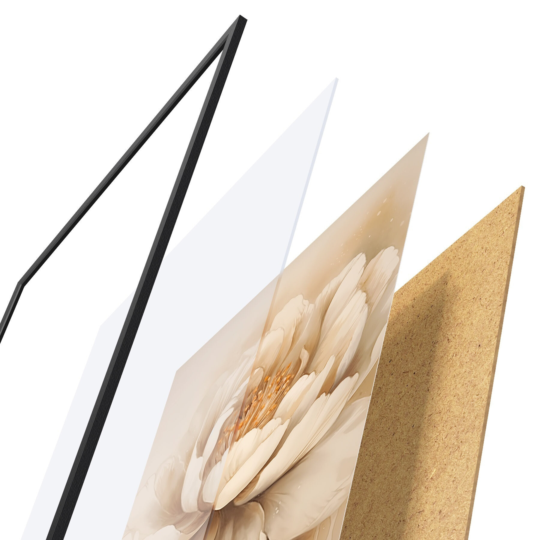 Plakat składa się z ramy, pleksi, wydrukowanego obrazu i podkładu z płyty wiórowej. Plakat można natychmiast zawiesić na ścianie dzięki uchwytom z tyłu.
