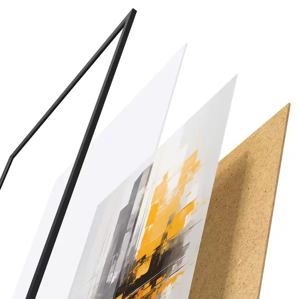 Plakat składa się z ramy, pleksi, wydrukowanego obrazu i podkładu z płyty wiórowej. Plakat można natychmiast zawiesić na ścianie dzięki uchwytom z tyłu.