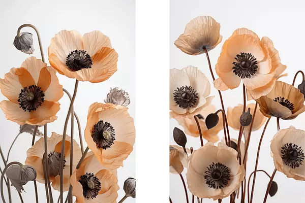 Poster Pomarańczowe maki, suszone kwiaty na jasnym tle, miękkie oświetlenie, delikatne płatki, kompozycja kwiatowa Nr d00518