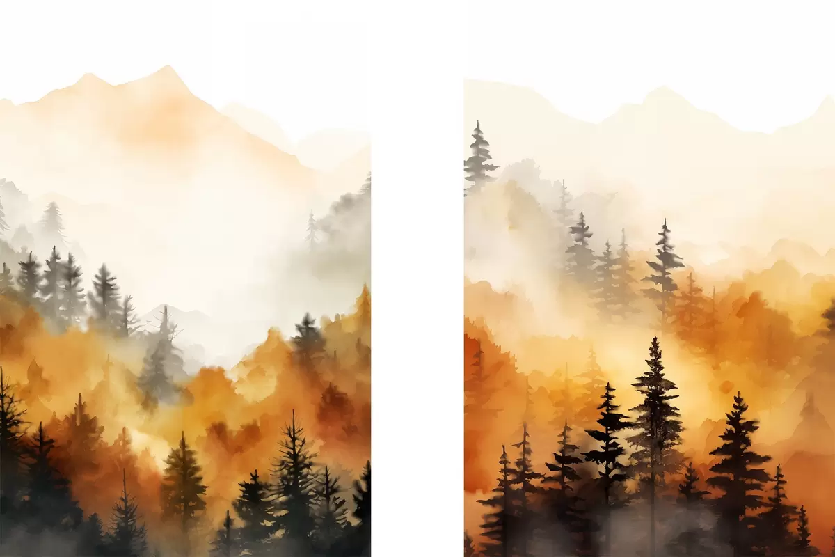 Poster Pejzaż akwarelowy imitujący las z wysokimi sosnami i górami w tle Nr d00519