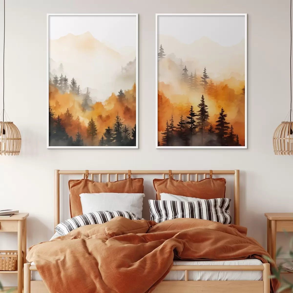 Plakat Pejzaż akwarelowy imitujący las z wysokimi sosnami i górami w tle d00519