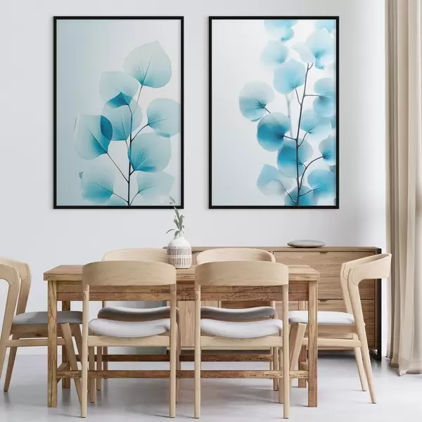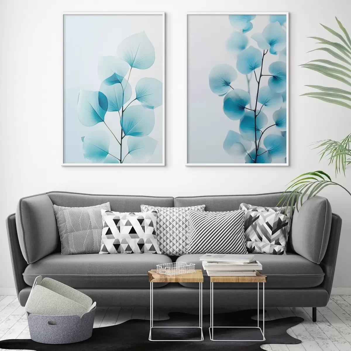 Poster Gałązka z półprzezroczystymi niebieskimi liśćmi, widoczne delikatne żyłki, lekka i spokojna kompozycja, minimalistyczna estetyka Nr d00522