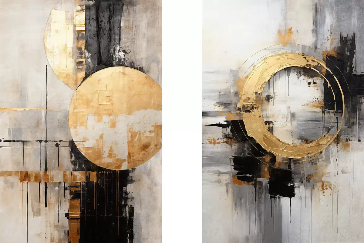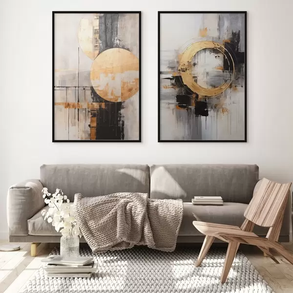 Poster Abstrakcyjny obraz z okręgami, czarnymi i żółtymi liniami oraz tłem w odcieniach szarości i bieli Nr d00527