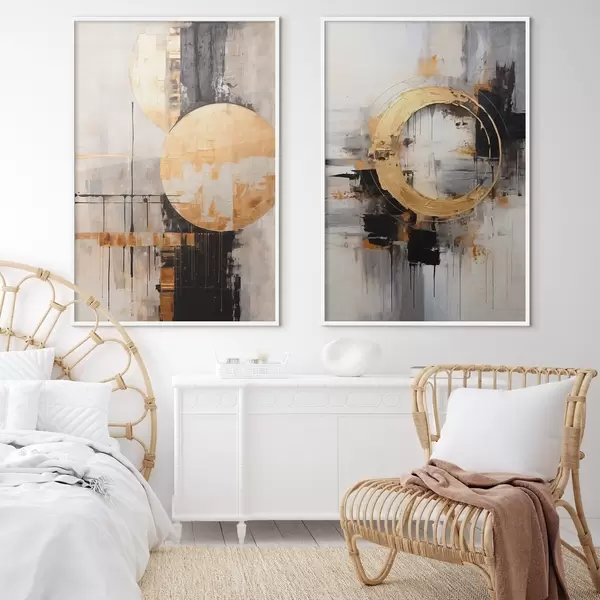 Plakat Abstrakcyjny obraz z okręgami, czarnymi i żółtymi liniami oraz tłem w odcieniach szarości i bieli d00527