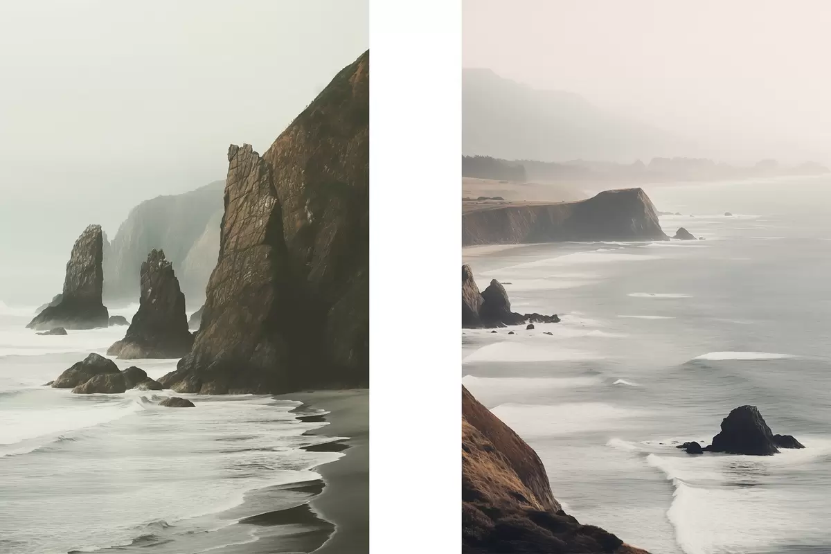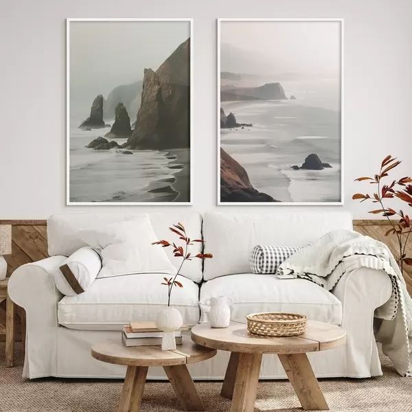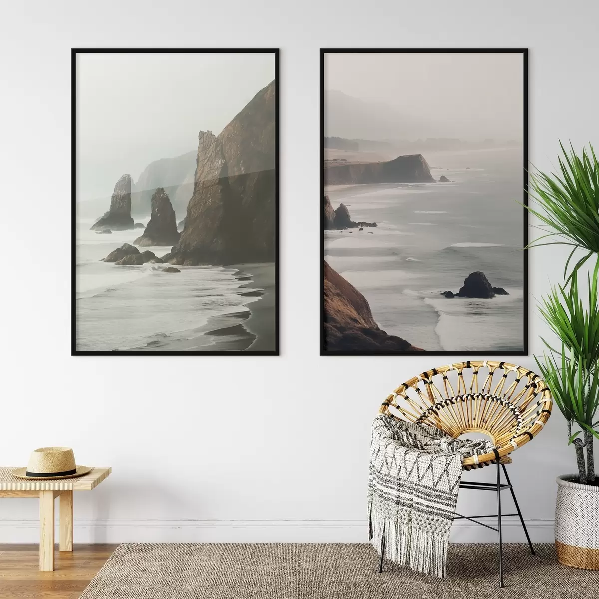 Plakat Skaliste klify i wybrzeże morskie, fale rozbijające się o brzeg, krajobraz z nastrojową atmosferą, ziemiste odcienie d00531