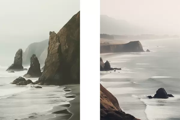 Poster Skaliste klify i wybrzeże morskie, fale rozbijające się o brzeg, krajobraz z nastrojową atmosferą, ziemiste odcienie Nr d00531