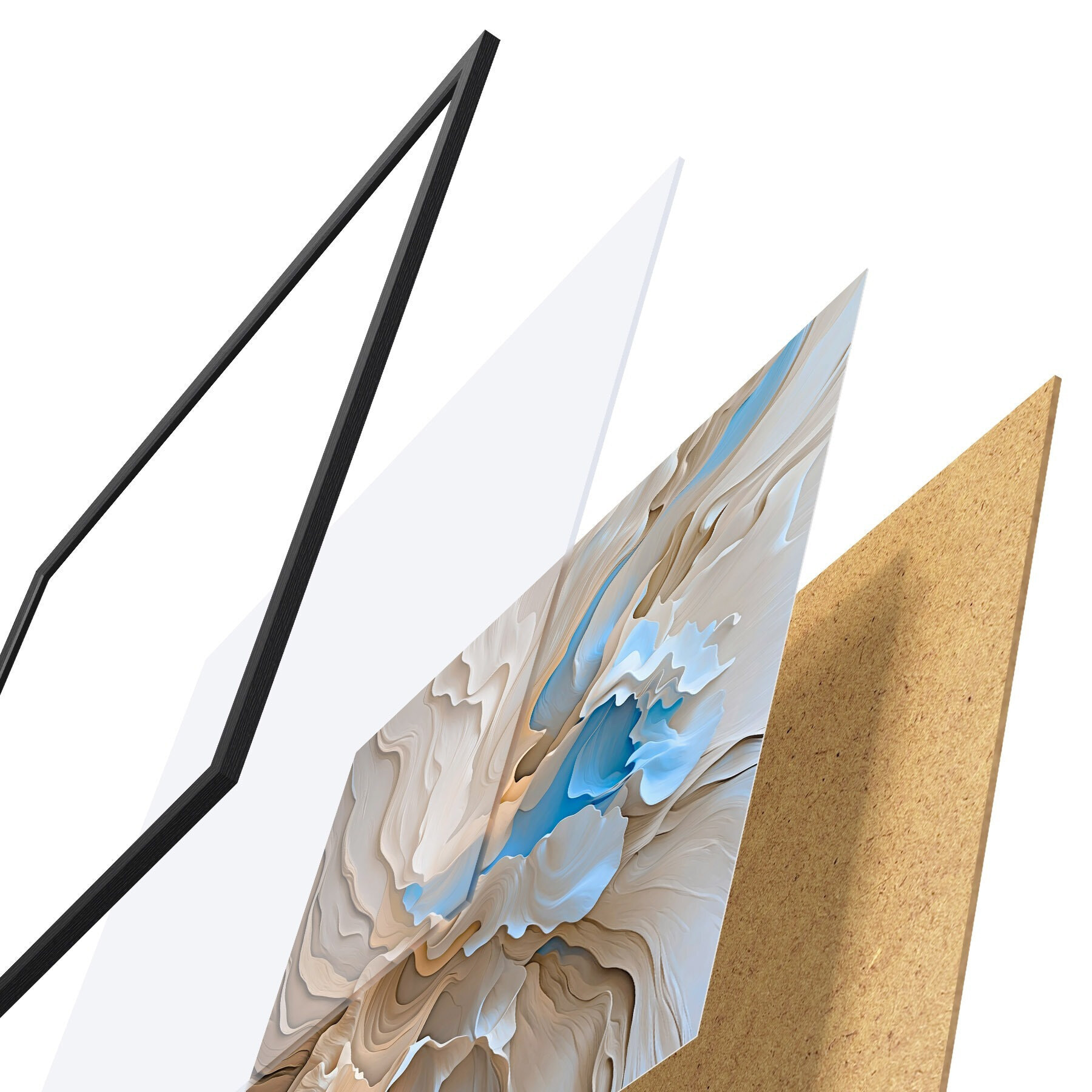 Plakat składa się z ramy, pleksi, wydrukowanego obrazu i podkładu z płyty wiórowej. Plakat można natychmiast zawiesić na ścianie dzięki uchwytom z tyłu.