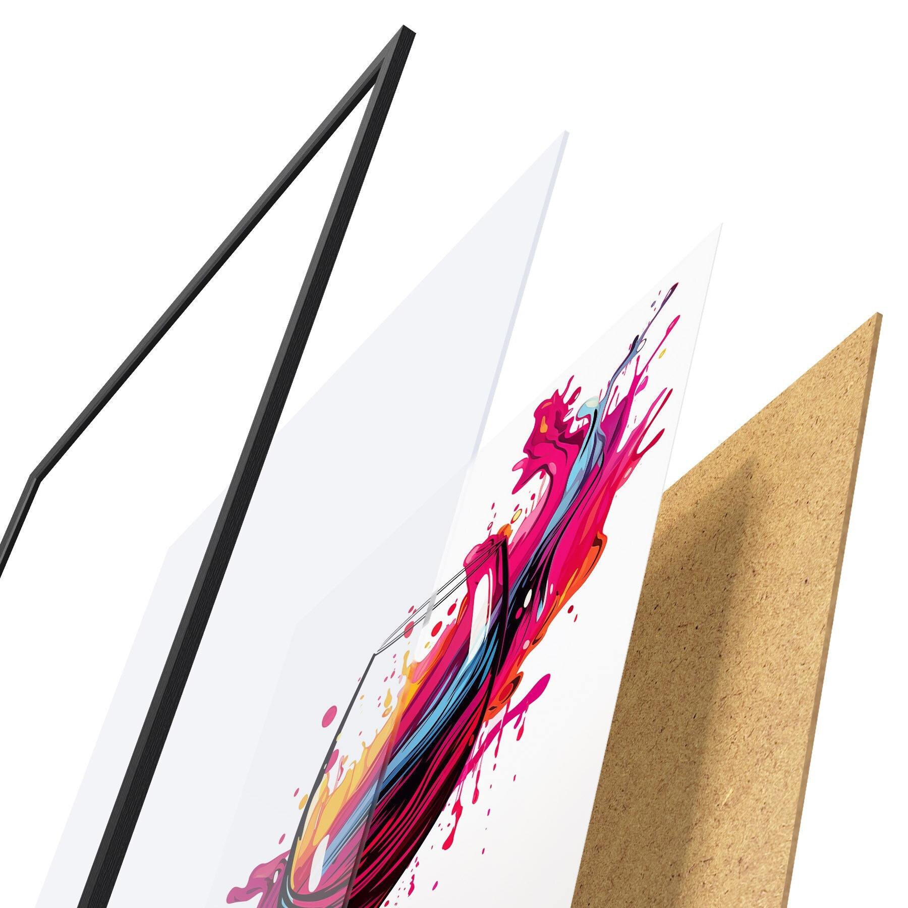 Plakat składa się z ramy, pleksi, wydrukowanego obrazu i podkładu z płyty wiórowej. Plakat można natychmiast zawiesić na ścianie dzięki uchwytom z tyłu.