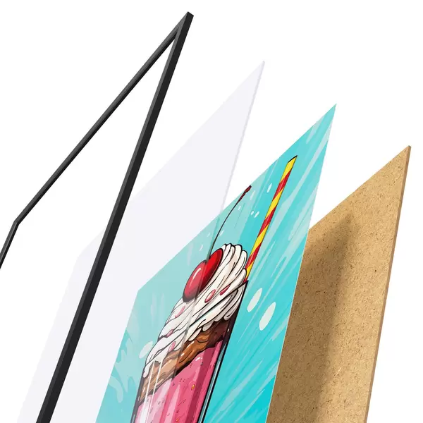 Plakat składa się z ramy, pleksi, wydrukowanego obrazu i podkładu z płyty wiórowej. Plakat można natychmiast zawiesić na ścianie dzięki uchwytom z tyłu.