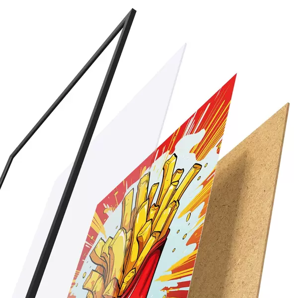 Plakat składa się z ramy, pleksi, wydrukowanego obrazu i podkładu z płyty wiórowej. Plakat można natychmiast zawiesić na ścianie dzięki uchwytom z tyłu.