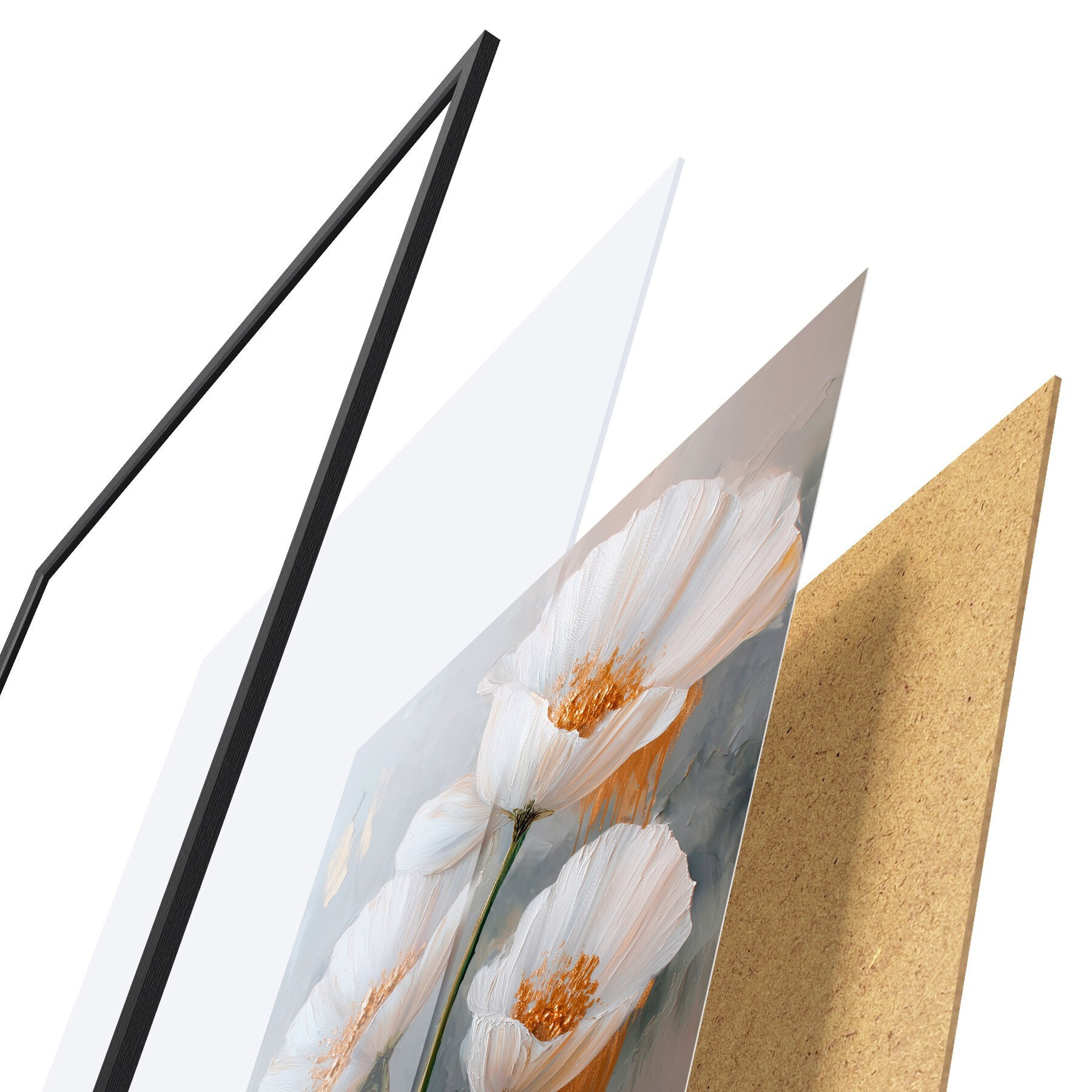Plakat składa się z ramy, pleksi, wydrukowanego obrazu i podkładu z płyty wiórowej. Plakat można natychmiast zawiesić na ścianie dzięki uchwytom z tyłu.