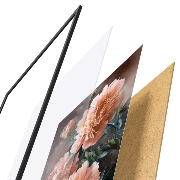 Plakat składa się z ramy, pleksi, wydrukowanego obrazu i podkładu z płyty wiórowej. Plakat można natychmiast zawiesić na ścianie dzięki uchwytom z tyłu.