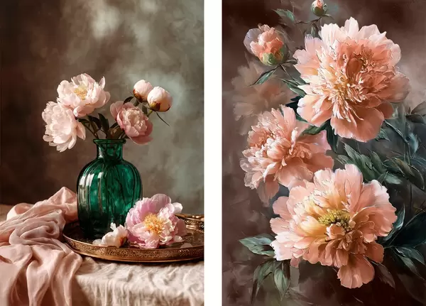 Poster Kompozycja z różowymi piwoniami w wazonie i na płótnie Nr d00578