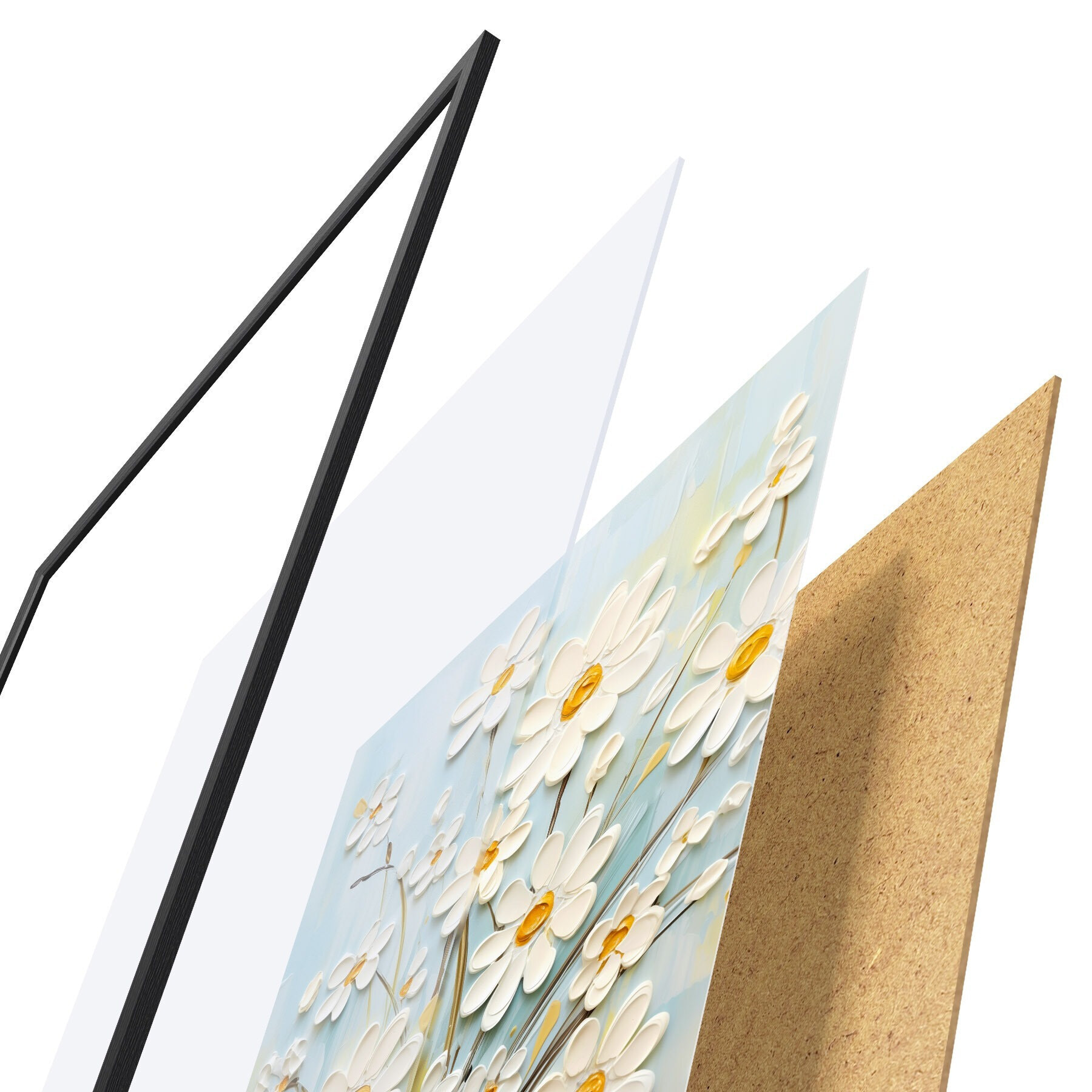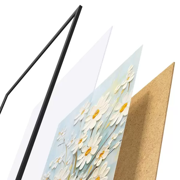 Plakat składa się z ramy, pleksi, wydrukowanego obrazu i podkładu z płyty wiórowej. Plakat można natychmiast zawiesić na ścianie dzięki uchwytom z tyłu.