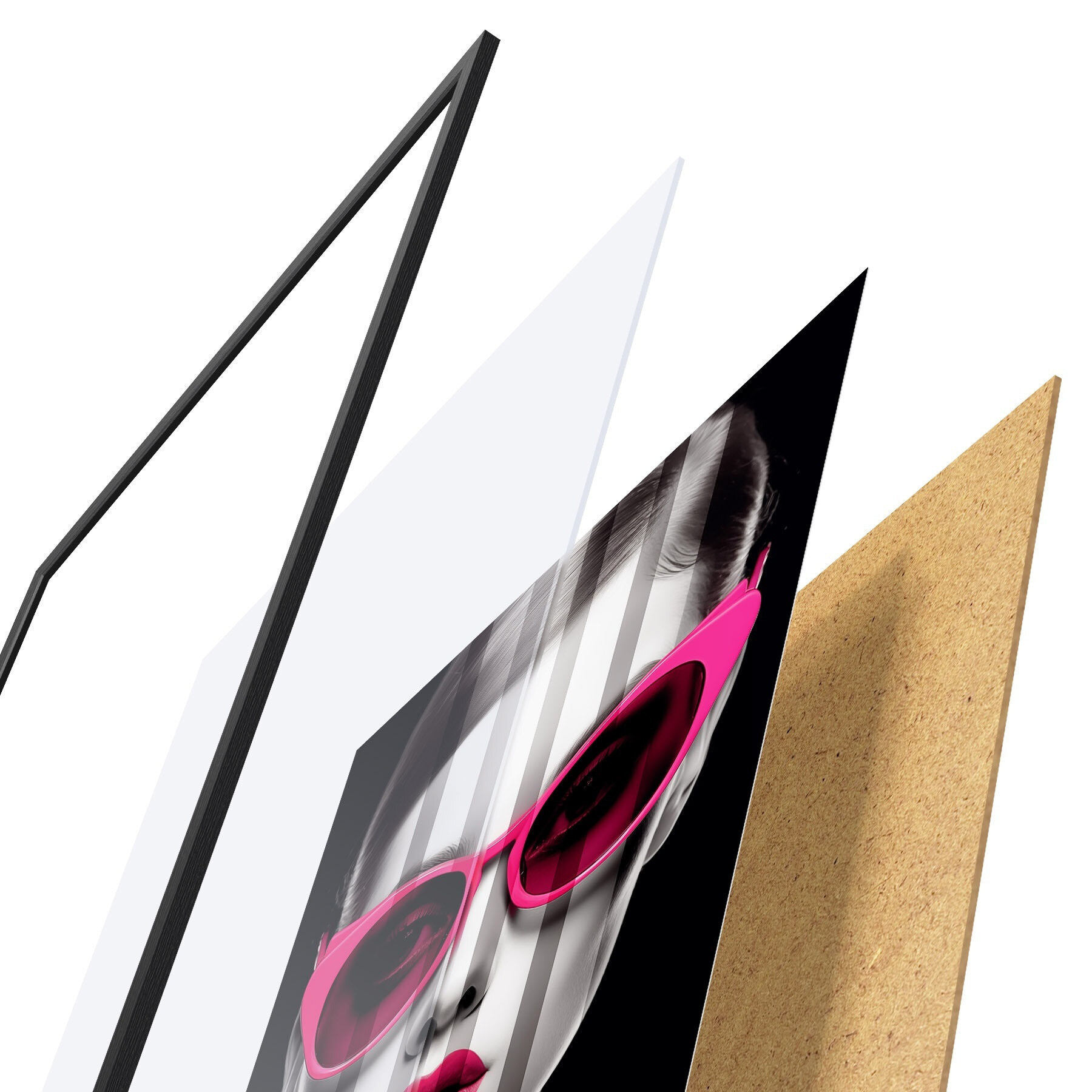 Plakat składa się z ramy, pleksi, wydrukowanego obrazu i podkładu z płyty wiórowej. Plakat można natychmiast zawiesić na ścianie dzięki uchwytom z tyłu.