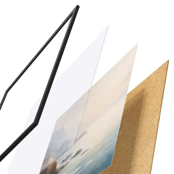 Plakat składa się z ramy, pleksi, wydrukowanego obrazu i podkładu z płyty wiórowej. Plakat można natychmiast zawiesić na ścianie dzięki uchwytom z tyłu.
