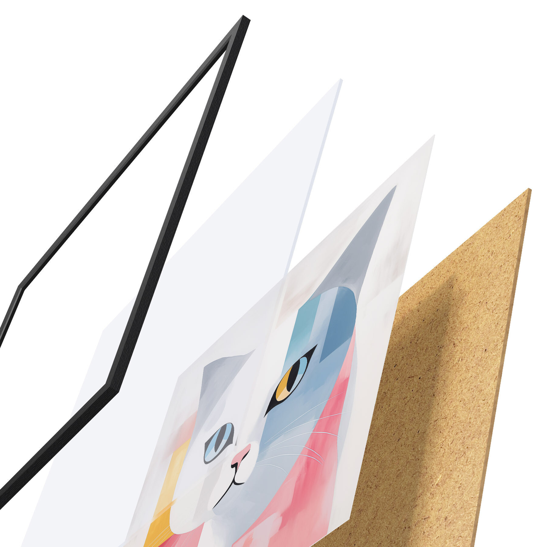 Plakat składa się z ramy, pleksi, wydrukowanego obrazu i podkładu z płyty wiórowej. Plakat można natychmiast zawiesić na ścianie dzięki uchwytom z tyłu.