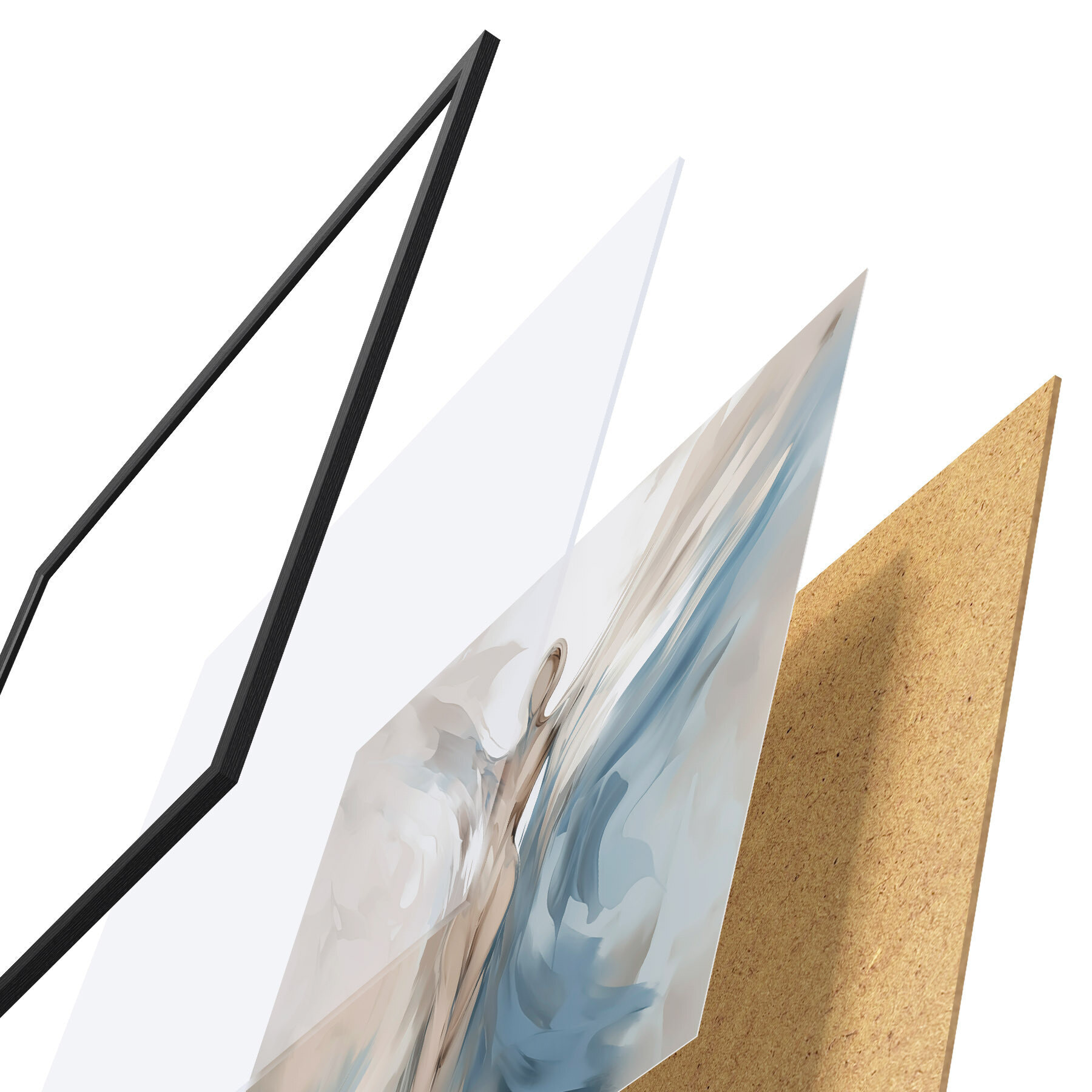 Plakat składa się z ramy, pleksi, wydrukowanego obrazu i podkładu z płyty wiórowej. Plakat można natychmiast zawiesić na ścianie dzięki uchwytom z tyłu.