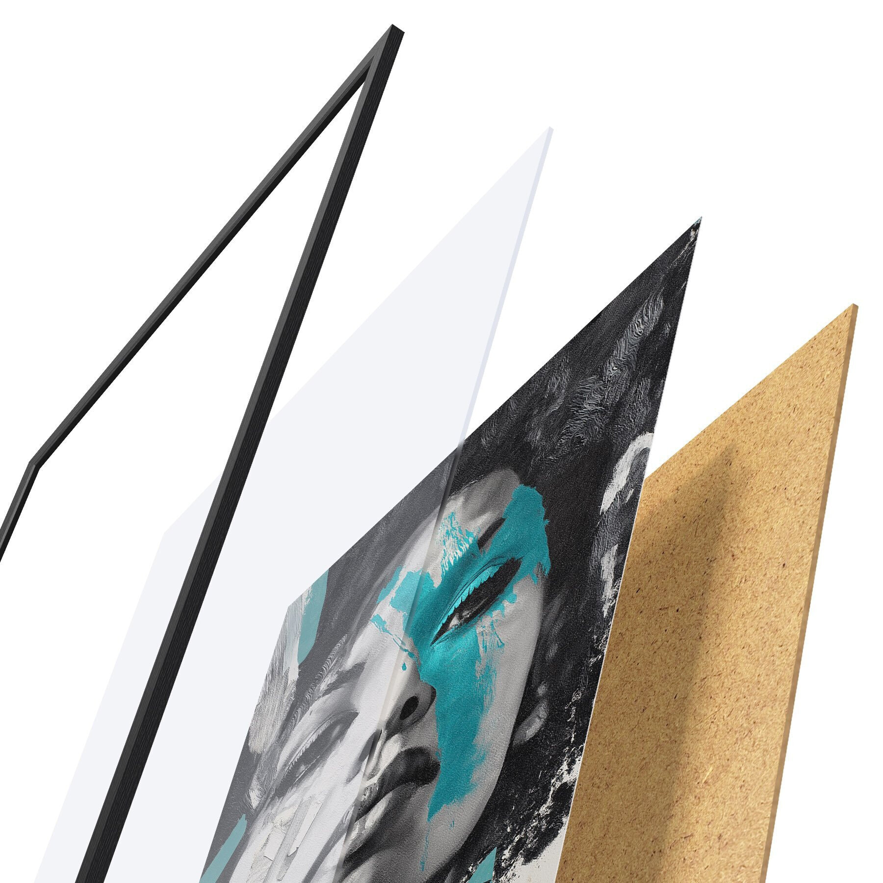 Plakat składa się z ramy, pleksi, wydrukowanego obrazu i podkładu z płyty wiórowej. Plakat można natychmiast zawiesić na ścianie dzięki uchwytom z tyłu.