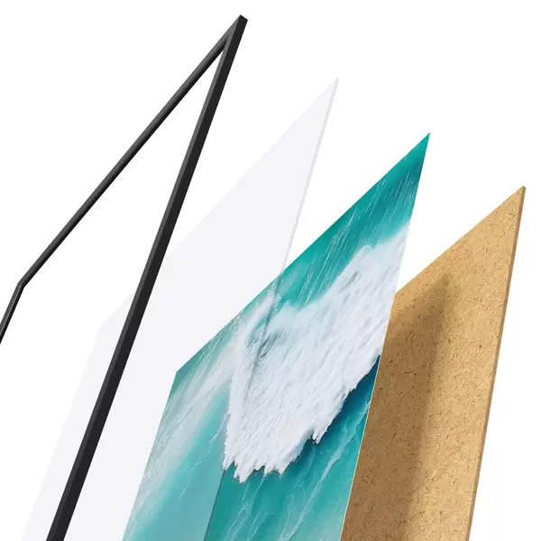 Plakat składa się z ramy, pleksi, wydrukowanego obrazu i podkładu z płyty wiórowej. Plakat można natychmiast zawiesić na ścianie dzięki uchwytom z tyłu.