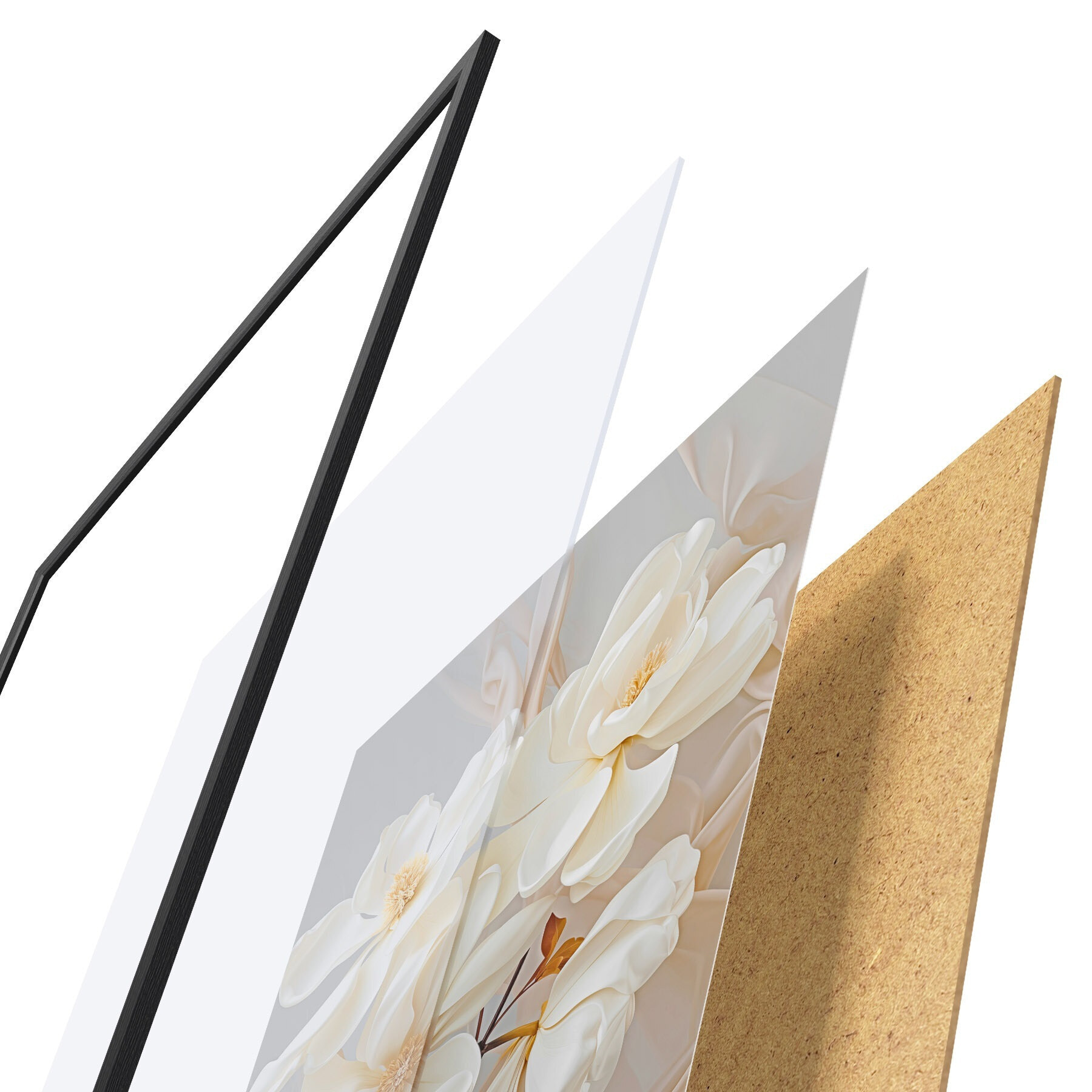 Plakat składa się z ramy, pleksi, wydrukowanego obrazu i podkładu z płyty wiórowej. Plakat można natychmiast zawiesić na ścianie dzięki uchwytom z tyłu.