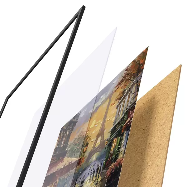 Plakat składa się z ramy, pleksi, wydrukowanego obrazu i podkładu z płyty wiórowej. Plakat można natychmiast zawiesić na ścianie dzięki uchwytom z tyłu.