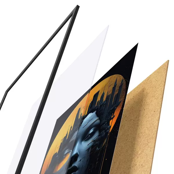 Plakat składa się z ramy, pleksi, wydrukowanego obrazu i podkładu z płyty wiórowej. Plakat można natychmiast zawiesić na ścianie dzięki uchwytom z tyłu.