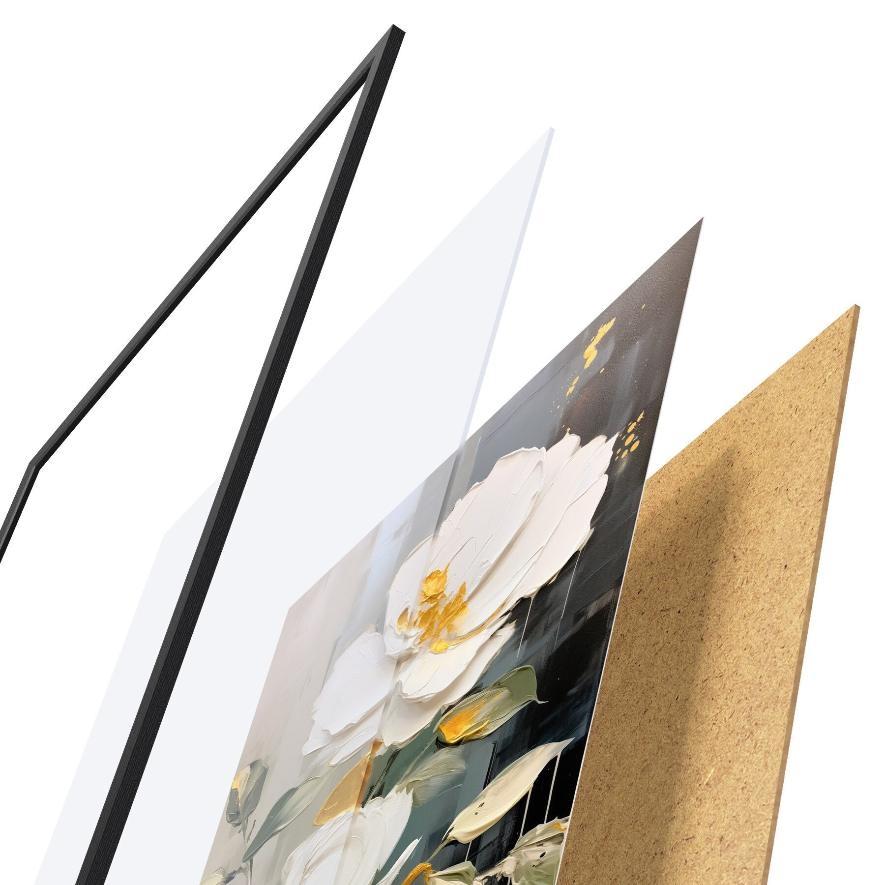 Plakat składa się z ramy, pleksi, wydrukowanego obrazu i podkładu z płyty wiórowej. Plakat można natychmiast zawiesić na ścianie dzięki uchwytom z tyłu.