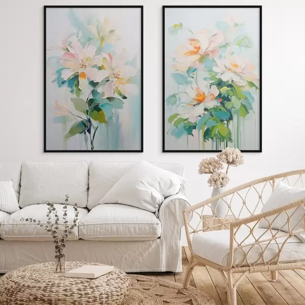 Poster Białe i pastelowe brzoskwiniowe kwiaty, zielone liście, miękkie pociągnięcia pędzla imitacja obrazu olejnego, jasnoniebieskie tło Nr d00644