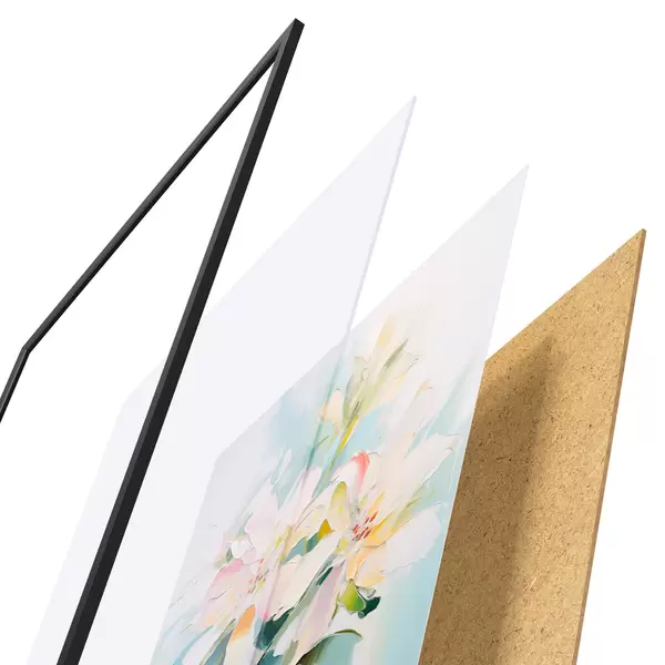 Plakat składa się z ramy, pleksi, wydrukowanego obrazu i podkładu z płyty wiórowej. Plakat można natychmiast zawiesić na ścianie dzięki uchwytom z tyłu.