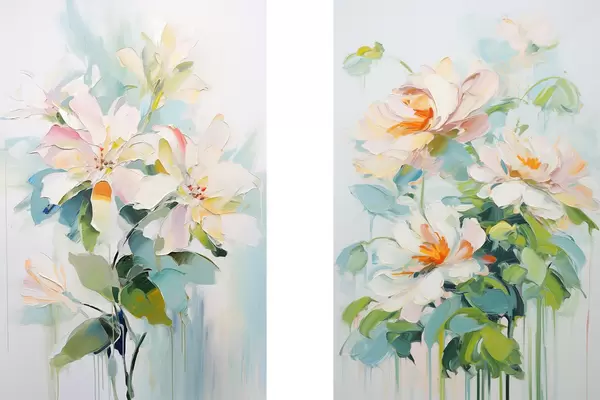 Poster Białe i pastelowe brzoskwiniowe kwiaty, zielone liście, miękkie pociągnięcia pędzla imitacja obrazu olejnego, jasnoniebieskie tło Nr d00644