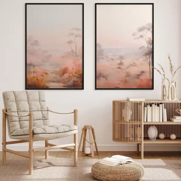 Poster Krajobraz z krzewami i drzewami w odcieniach różu, pomarańczy i brązu, z górami w tle Nr d00646