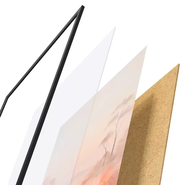 Plakat składa się z ramy, pleksi, wydrukowanego obrazu i podkładu z płyty wiórowej. Plakat można natychmiast zawiesić na ścianie dzięki uchwytom z tyłu.