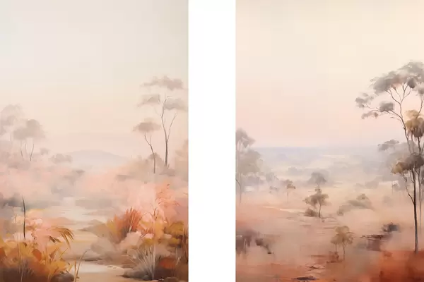 Poster Krajobraz z krzewami i drzewami w odcieniach różu, pomarańczy i brązu, z górami w tle Nr d00646