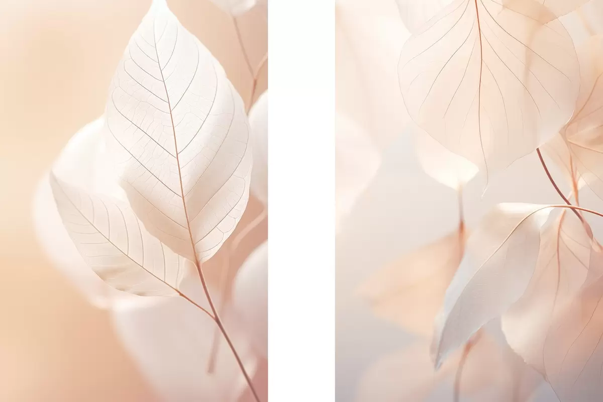 Poster Zbliżenie półprzezroczystych liści z delikatnymi żyłkami, miękka brzoskwiniowa i biała paleta kolorów, rozmyte tło Nr d00647