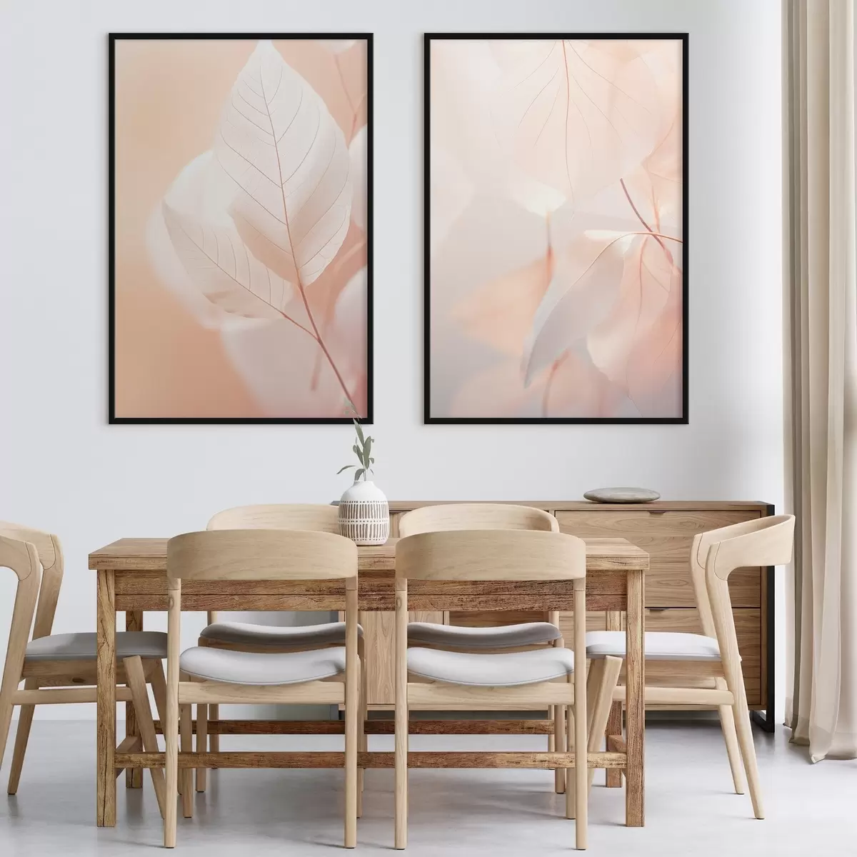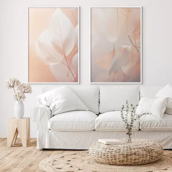 Plakat Zbliżenie półprzezroczystych liści z delikatnymi żyłkami, miękka brzoskwiniowa i biała paleta kolorów, rozmyte tło d00647