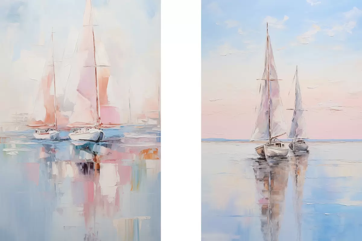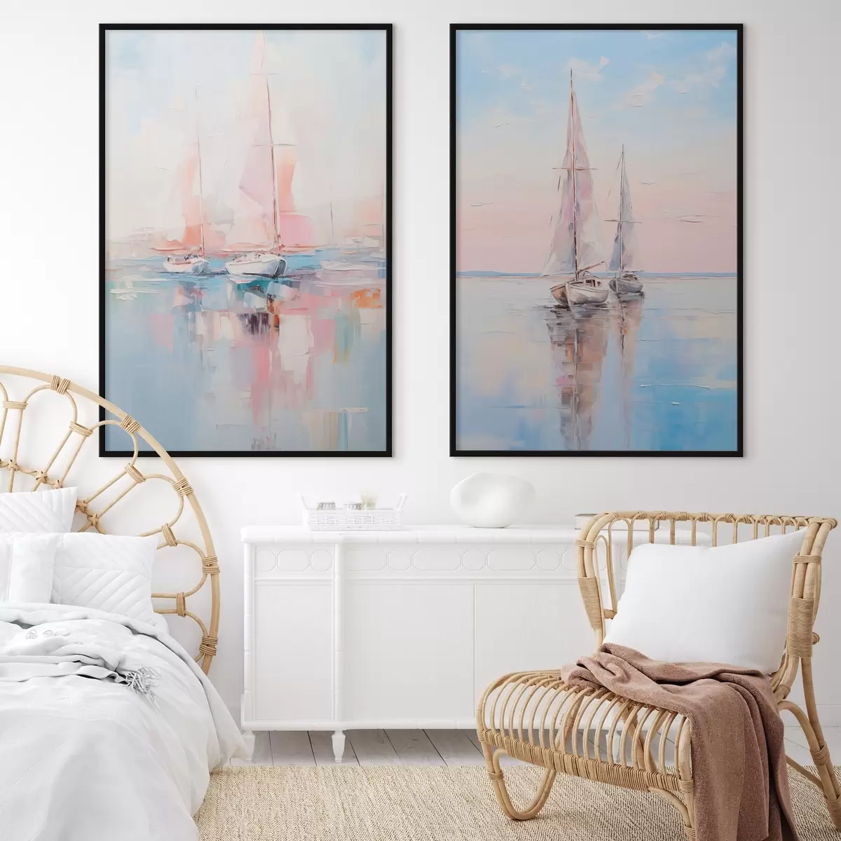 Poster Żaglówki z różowymi żaglami unoszące się na spokojnym morzu, odbicia łodzi w wodzie, delikatne pastelowe kolory Nr d00648