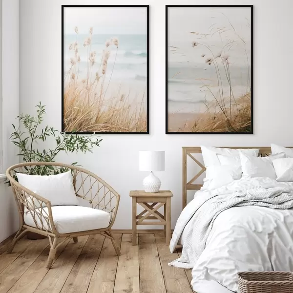Plakat Wysoka trawa z puszystymi główkami nasion, piaszczysta plaża i fale oceanu w tle, miękka i stonowana paleta kolorów d00650